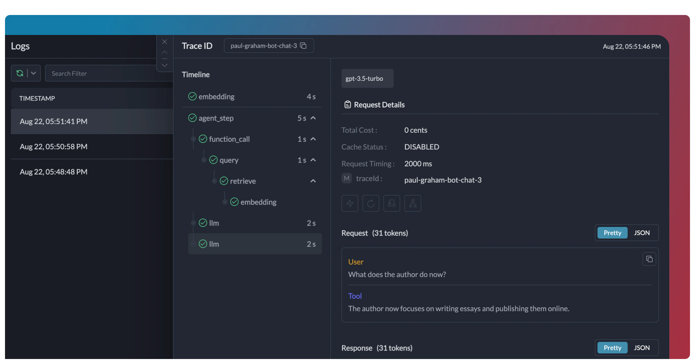 trace_id across multiple agents and requests to track the entire workflow. This is especially useful for multi-agent systems where you want to understand the full execution path.How do I filter logs and traces for specific agent runs?
