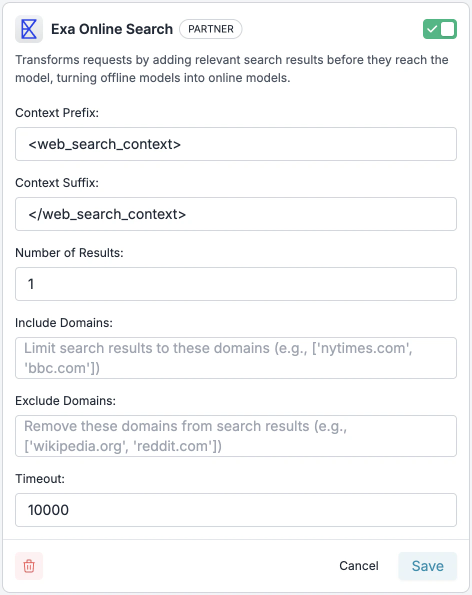 The Exa Online Search plugin automatically adds a context window with relevant search results from the internet before your prompt reaches the LLM: