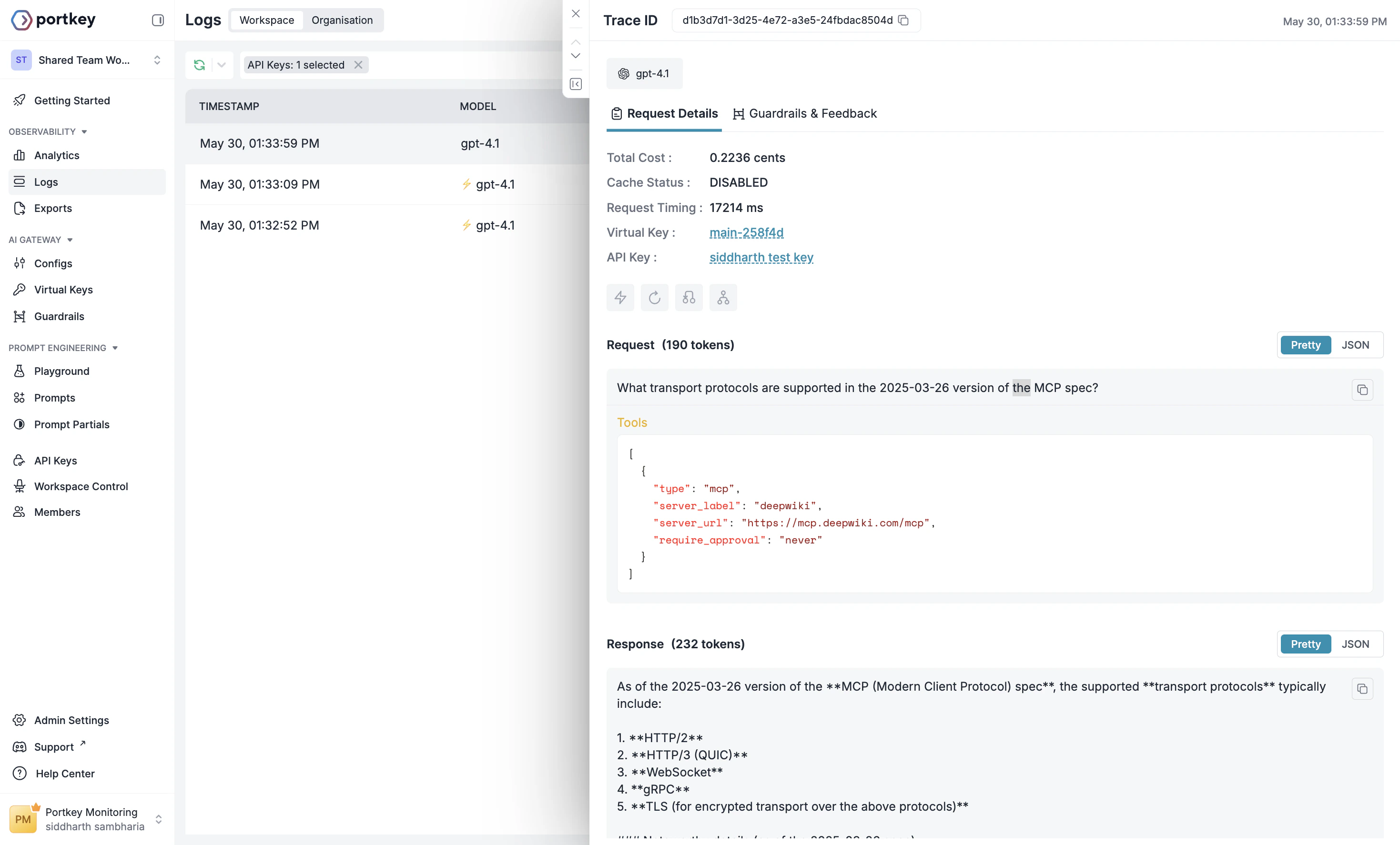 Model Context Protocol (MCP) is an open protocol that standardizes how applications provide tools and context to LLMs. The MCP tool in the Responses API allows developers to give the model access to tools hosted on Remote MCP servers. These are MCP servers maintained by developers and organizations across the internet that expose these tools to MCP clients, like the Responses API. Portkey Supports using MCP server via the Response API. Calling a remote MCP server with the Responses API is straightforward. For example, here’s how you can use the DeepWiki MCP server to ask questions about nearly any public GitHub repository.